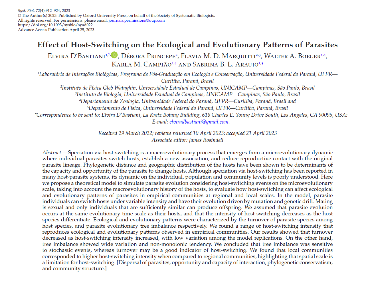 17. D’Bastiani, E.; Princepe, D.; Campião, K. M.; Marquitti, F. M.; Boeger, W. A.; Araujo, S. L. 2023. Effect of host-switching on the eco-evolutionary patterns of parasites. Systematic Biology ISSN: 1063-5157, Volume: 72, Issue: 4, Page: 912-924. DOI: https://doi.org/10.1093/sysbio/syad022.